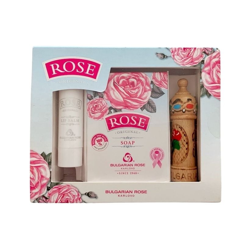 This elegant gift set includes a nourishing rose lip balm, moisturising rose soap, and a concentrated rose perfume essence housed in a traditional wooden muscal. Made with authentic Bulgarian Rosa Damascena Oil, each product captures the purity and beauty of the Queen of Flowers, offering a luxurious, all-natural experience for skin, senses, and soul.